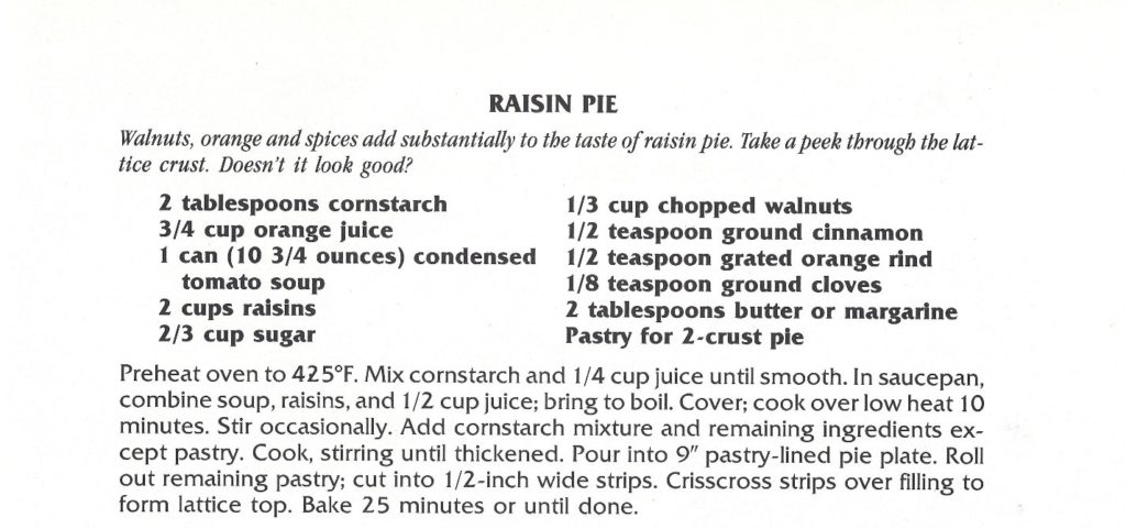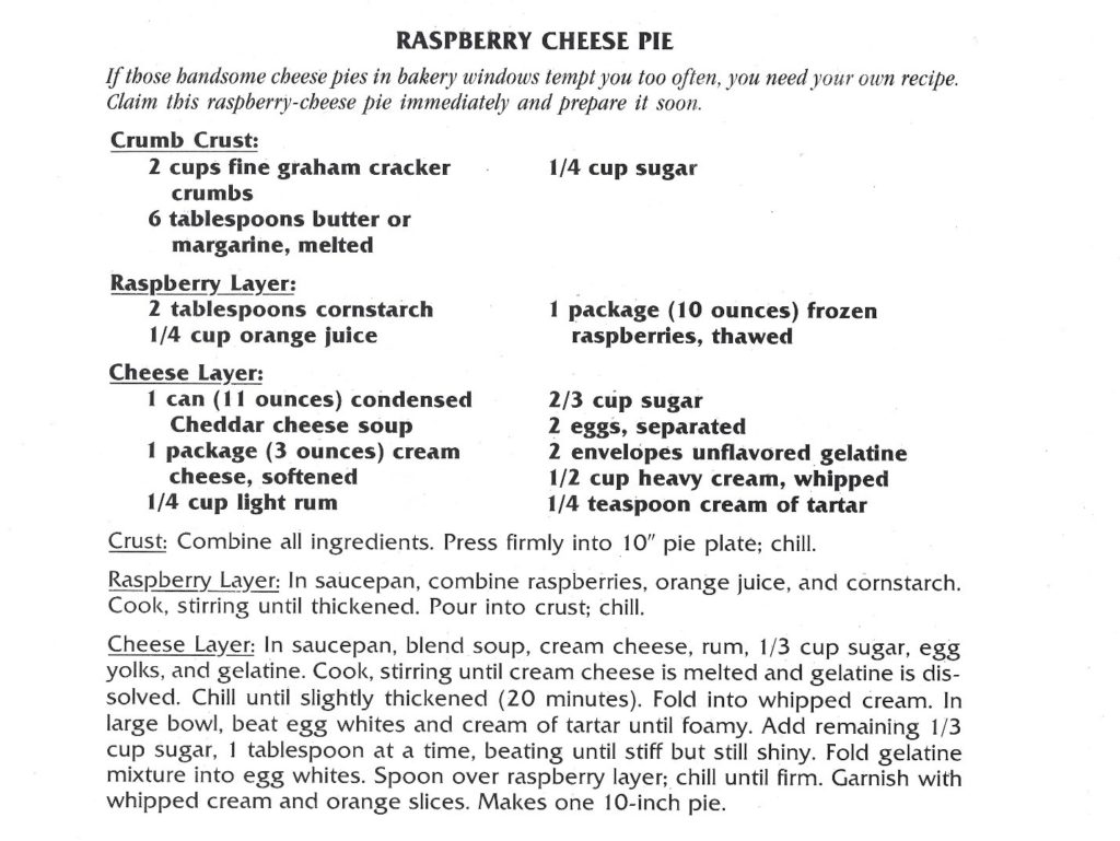 From 1978 we have a recipe for a Raspberry Cheese Pie, which features Campbell’s Condensed Cheddar Cheese soup. Maybe not the classic way to make cheesecake, but I wouldn’t mind trying a slice.