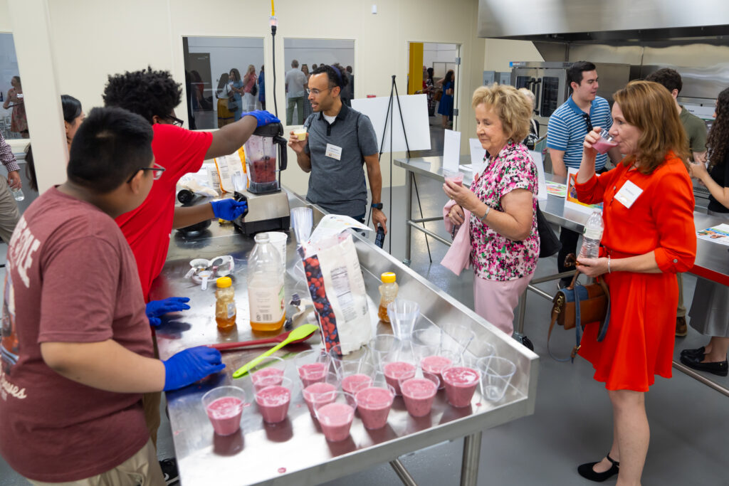 Trying food samples in the new teaching kitchen.